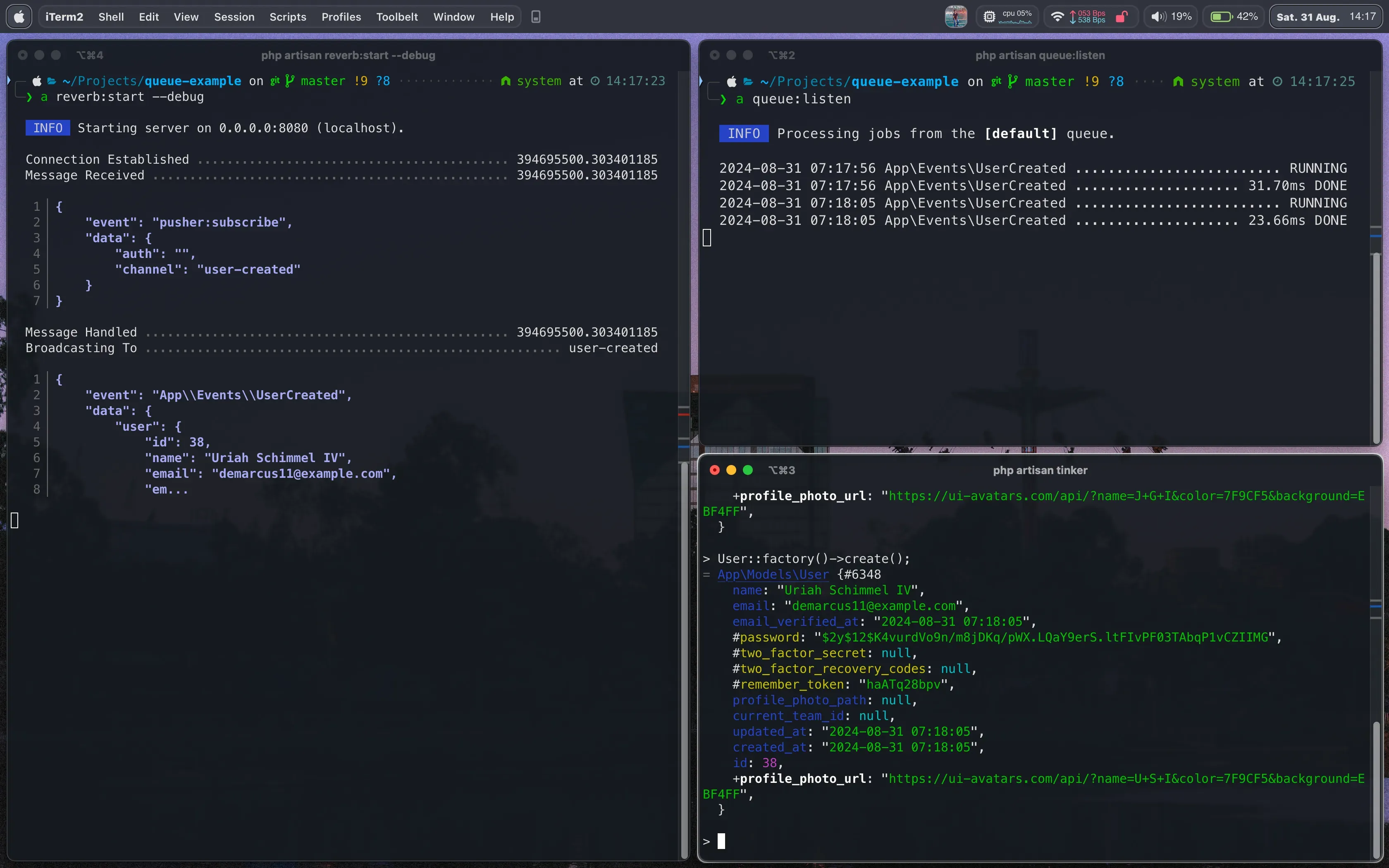 Saat tinker di-trigger, queue dijalankan di-background dan mengeksekusi event UserCreated dan mengirim sinyal ke frontend bahwa ada user yang baru dibuat